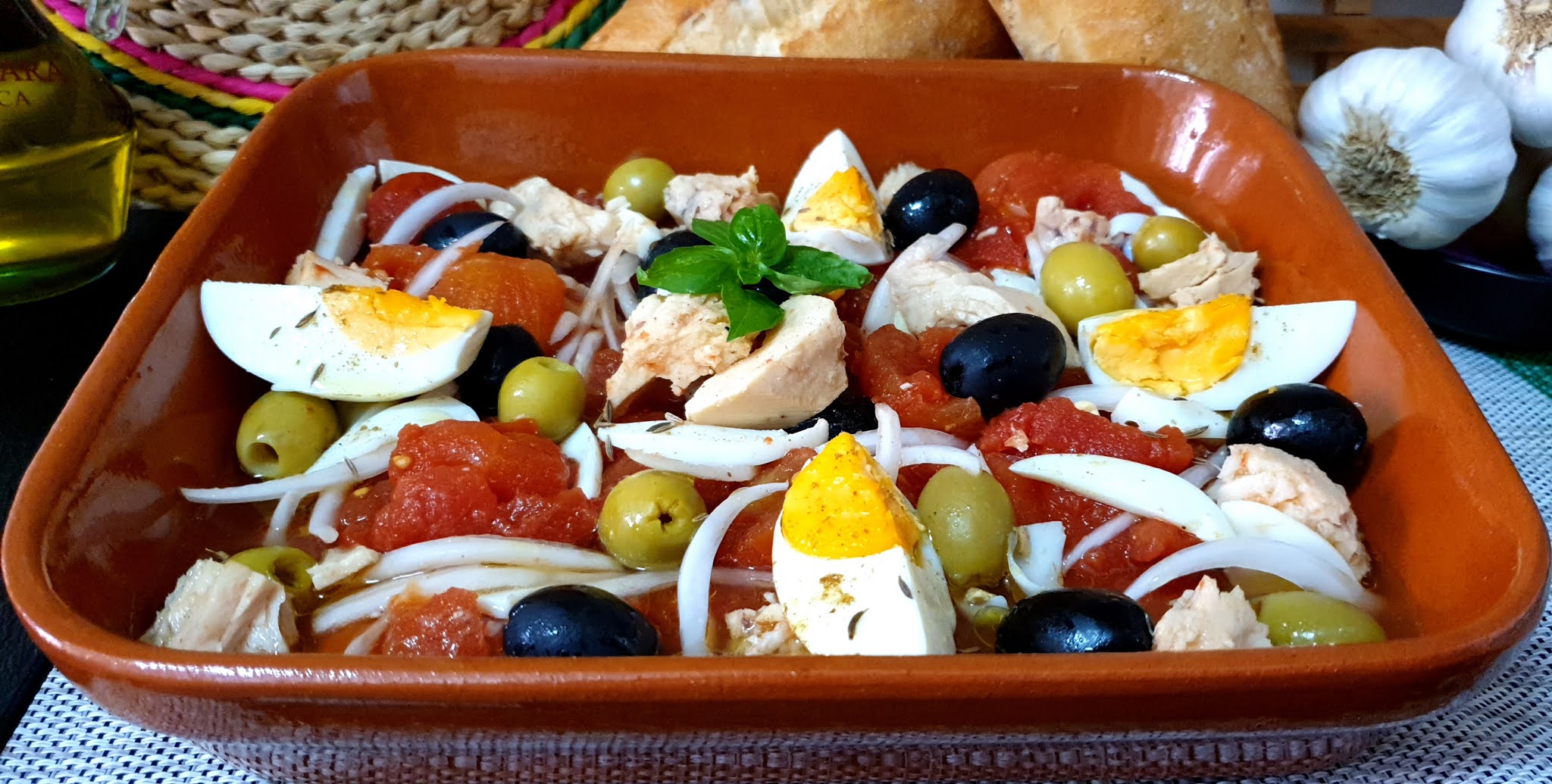 - Ponemos el tomate en un bol y lo cortamos en trozos (no demasiado pequeños), añadimos el atún (previamente escurrido y troceado), las aceitunas, los huevos cocidos (troceados), la cebolleta cortada en juliana, un diente de ajo muy picadito, una pizca de comino, un chorrete de aceite de oliva, probamos de sal, mezclamos todo y listo.